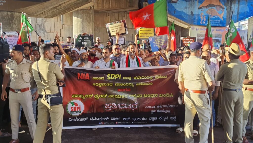 ಎಸ್ ಡಿಪಿ ಐ ದಕ್ಷಿಣ ಕನ್ನಡ ಜಿಲ್ಲಾ ಕಚೇರಿಯ ಮೇಲೆ ರಾಷ್ಟ್ರೀಯ ತನಿಖಾ ದಳ ನಡೆಸಿದ ಅತಿಕ್ರಮಣದ ದಾಳಿ ಮತ್ತು ಪಾಪ್ಯುಲರ್ ಫ್ರಂಟ್ ನಾಯಕರ ಅಕ್ರಮ ಬಂಧನವನ್ನು ಖಂಡಿಸಿ ಸೋಶಿಯಲ್ ಡೆಮೋಕ್ರಟಿಕ್ ಪಾರ್ಟಿ ಆಫ್ ಇಂಡಿಯಾ ( ಎಸ್ಡಿಪಿಐ ) ಮಂಗಳೂರು ವಿಧಾನಸಭಾ ಕ್ಷೇತ್ರ ಸಮಿತಿಯ ವತಿಯಿಂದ ತೊಕ್ಕೊಟ್ಟು ಜಂಕ್ಷನ್ ನಲ್ಲಿ ಶನಿವಾರ ನಡೆದ ಪ್ರತಿಭಟನೆಯಲ್ಲಿ ಅವರು ಮಾತನಾಡಿದರು.