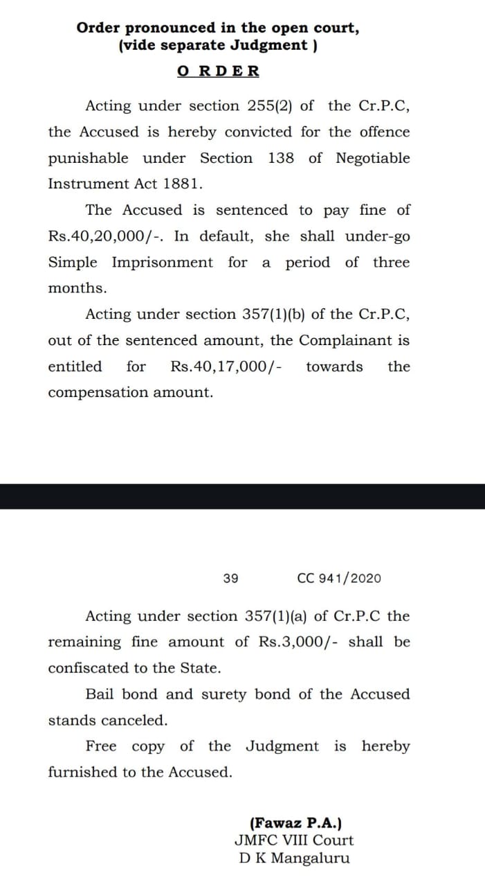 ಆದರೆ ಪೊಲೀಸರು ಬಂಧಿಸುವ ಮೊದಲೇ ಪದ್ಮಜಾ ರಾವ್ ಮಂಗಳೂರು ನ್ಯಾಯಾಲದಲ್ಲಿ ಶರಣಾಗಿ ಜಾಮೀನು ಪಡೆದಿದ್ದರು.ಬಳಿಕ ನಾಲ್ಕು ವರ್ಷಗಳಿಂದ ನ್ಯಾಯಾಲಯದಲ್ಲಿ ಪ್ರಕರಣ ಮುಂದುವರಿದಿತ್ತು. ಇದೀಗ ಈ ಪ್ರಕರಣದಲ್ಲಿ ಪದ್ಮಜಾರಾವ್ ಆರೋಪ ಸಾಬೀತಾಗಿದೆ.40,17,000 ಸಾವಿರ ರೂಪಾಯಿಗಳನ್ನು ದೂರುದಾರ ವೀರೇಂದ್ರ ಶೆಟ್ಟಿಯವರಿಗೆ ಪಾವತಿಸಲು ಮಂಗಳೂರಿನ JMFC 8ನೇ ನ್ಯಾಯಾಲಯ ಆದೇಶಿಸಿದ್ದು ಜೊತೆಗೆ ಜುಲ್ಮಾನೆಯಾಗಿ ಸರಕಾರಕ್ಕೆ 3000 ಸಾವಿರ ರೂಪಾಯಿಗಳನ್ನು ಪಾವತಿಸುವಂತೆ ಆದೇಶಿಸಿದ್ದು ಇಲ್ಲವಾದಲ್ಲಿ ಮೂರು ತಿಂಗಳ ಜೈಲು ಶಿಕ್ಷೆಯನ್ನು ವಿಧಿಸಿ ಕೋರ್ಟ್ ಆದೇಶ ನೀಡಿದೆ.