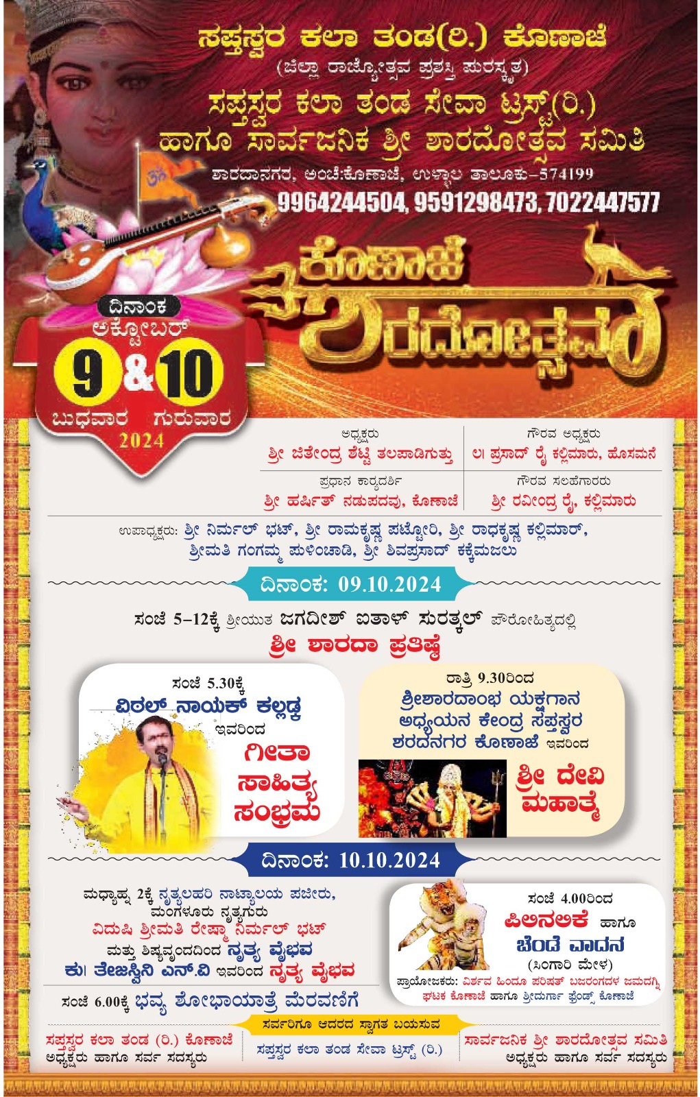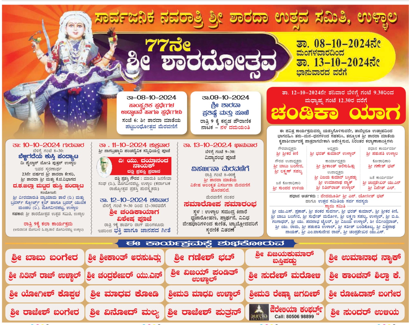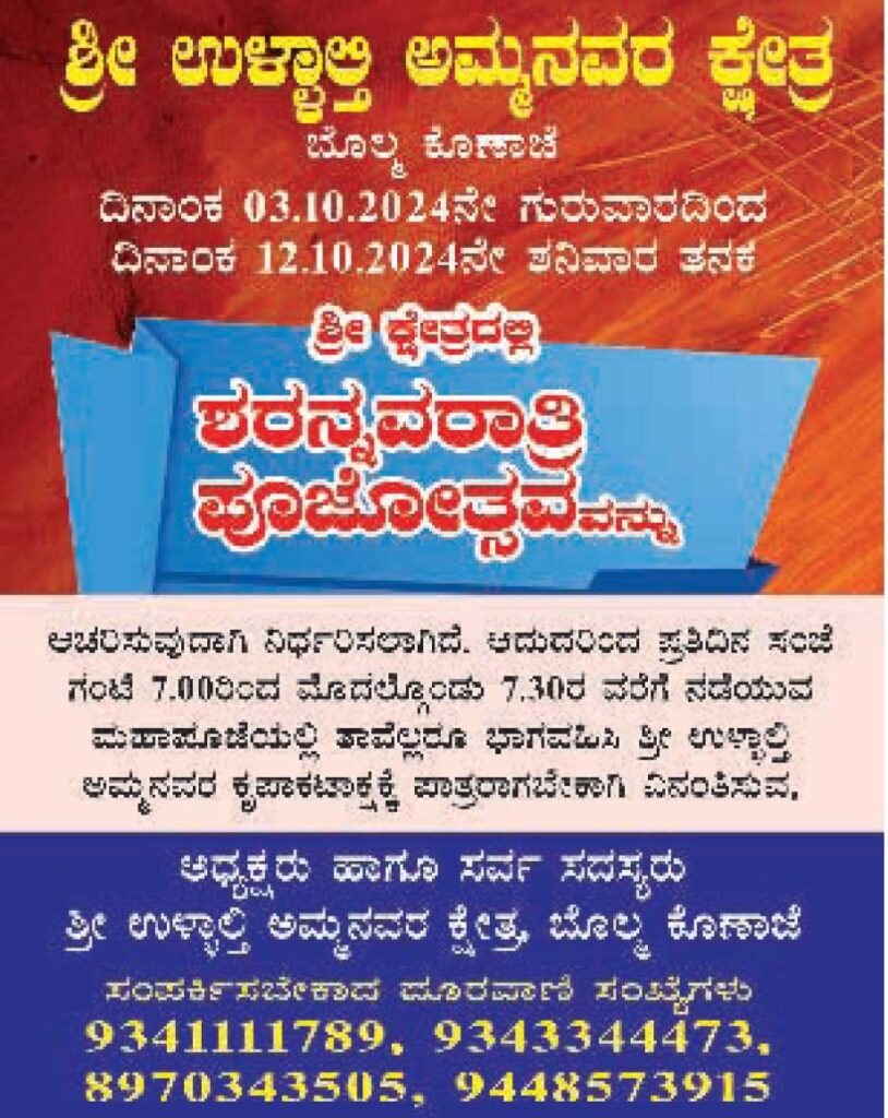 ಅ.12 ರಂದು ಕ್ಷೇತ್ರದಲ್ಲಿ ಆಯುಧ ಪೂಜೆಯು ನಡೆಯಲಿರುವುದು.ಅ.13ರಂದು ಕ್ಷೇತ್ರದಲ್ಲಿ ಮಕ್ಕಳಿಗೆ ವಿದ್ಯಾರಂಭ ನಡೆಯಲಿರುವುದು.ಅ.13 ರಂದು ಬೆಳಿಗ್ಗೆ ಲೋಕ ಕಲ್ಯಾಣಾರ್ಥವಾಗಿ ಸಾಮೂಹಿಕ ಚಂಡಿಕಾಹವನ ನಡೆಯಲಿರುವುದು.ಅದೇ ದಿನ ಸಂಜೆ ಭರತನಾಟ್ಯ ಕ್ಷೇತ್ರದಲ್ಲಿ ಅದ್ವಿತೀಯ ಸಾಧನೆ ಮಾಡಿರುವ,ಸಾವಿರಾರು ಶಿಷ್ಯರನ್ನು ಹೊಂದಿರುವ ರಾಜ್ಯೋತ್ಸವ ಪ್ರಶಸ್ತಿ ,ಶಾಂತಲಾ ನಾಟ್ಯ ಪ್ರಶಸ್ತಿ ಪುರಸ್ಕೃತರಾದ ನಾಟ್ಯಾಚಾರ್ಯ ಉಳ್ಳಾಲ ಶ್ರೀ ಮೋಹನ್ ಕುಮಾರ್ ಅವರಿಗೆ ಅಭಿನಂದನಾ ಕಾರ್ಯಕ್ರಮ ನಡೆಯಲಿದೆ ಎಂದು ಹೇಳಿದರು.