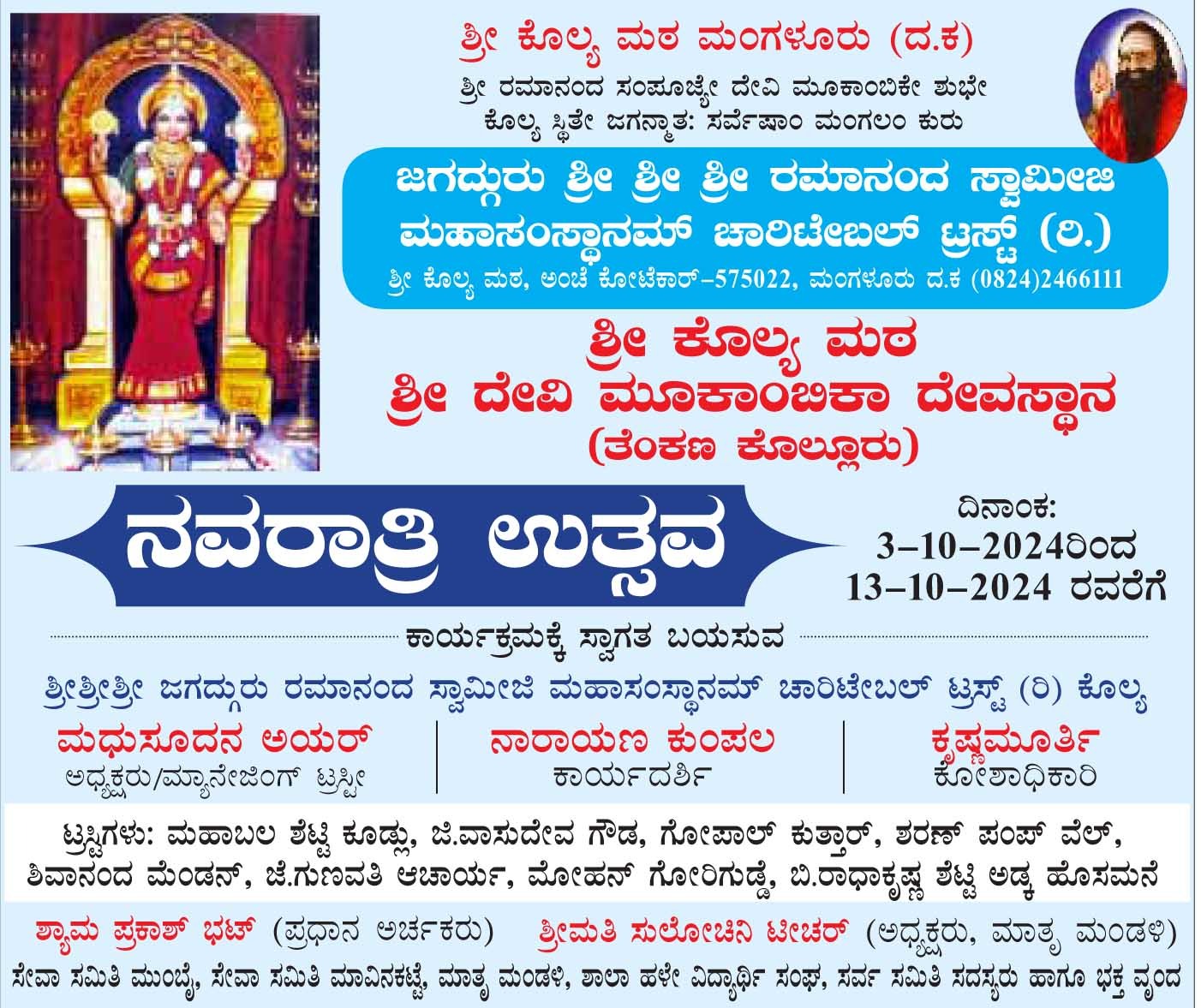 ಪತ್ರಿಕಾಗೋಷ್ಠಿಯಲ್ಲಿ ಶ್ರೀ ದೇವಿ ಮೂಕಾಂಬಿಕಾ ದೇವಸ್ಥಾನದ ಆಡಳಿತ ಕಮಿಟಿಯ ಕಾರ್ಯದರ್ಶಿ ನಾರಾಯಣ ಕುಂಪಲ,ಮಾಜಿ ಅಧ್ಯಕ್ಷರಾದ ಮಹಾಬಲ ಶೆಟ್ಟಿ, ಟ್ರಸ್ಟಿಗಳಾದ ಗೋಪಾಲ ಕುತ್ತಾರ್,ರಾಧಾಕೃಷ್ಣ ಶೆಟ್ಟಿ, ಜಿ. ವಾಸುದೇವ ಗೌಡ,ಶಿವಾನಂದ ಮೆಂಡನ್,ಮೋಹನ್ ಗೋರಿಗುಡ್ಡ, ಗುಣವತಿ ಆಚಾರ್, ಮಾತೃಮಂಡಳಿ ಅಧ್ಯಕ್ಷರಾದ ಸುಲೋಚಿನಿ ಟೀಚರ್ ಉಪಸ್ಥಿತರಿದ್ದರು.