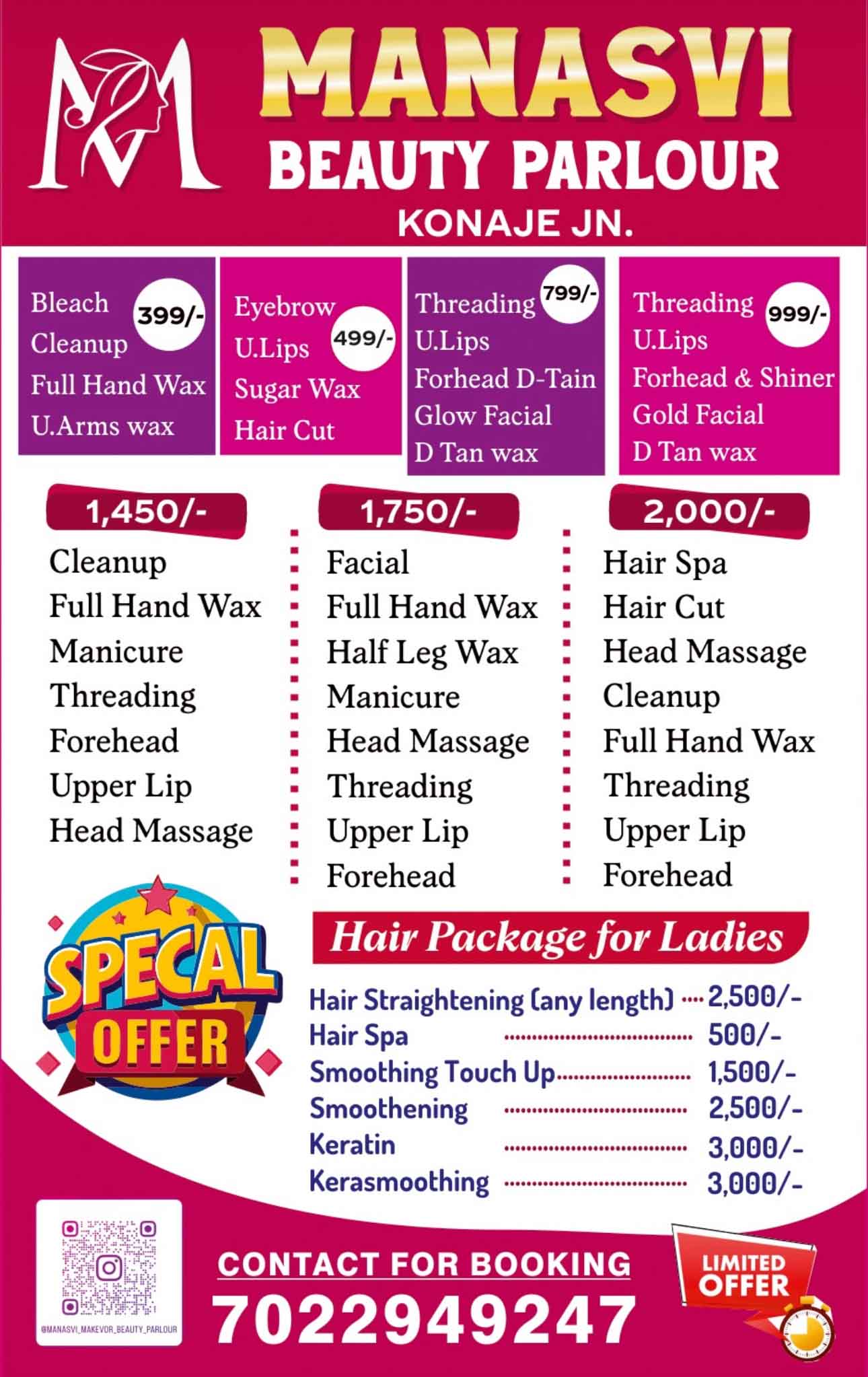 ಮನಸ್ವೀ ಬ್ಯೂಟಿ ಪಾರ್ಲರ್‌ನಿಂದ ವಿಶೇಷ ಆಫರ್‌ಗಳು