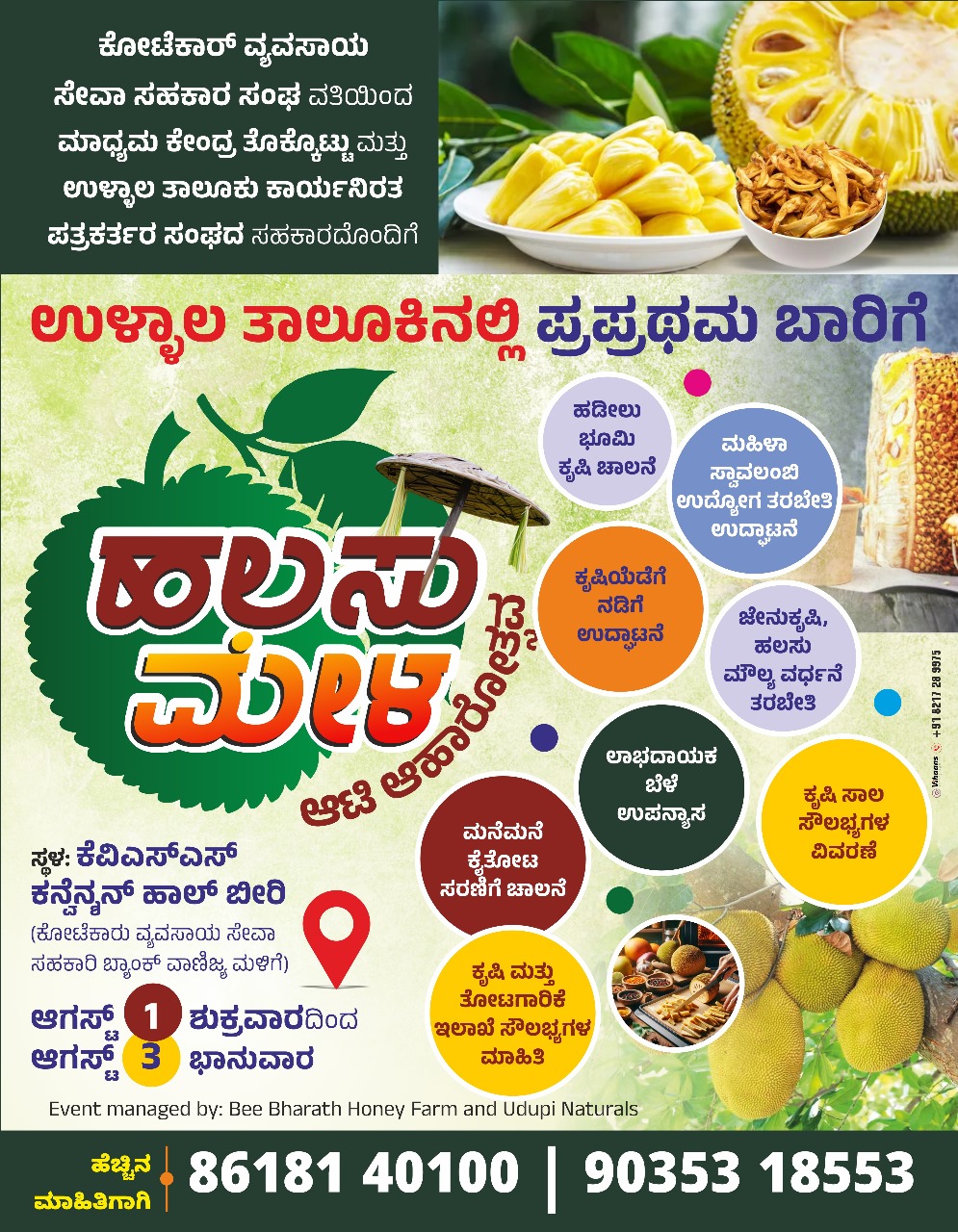 ಮಂಗಳೂರು:ಕೋಟೆಕಾರ್ ಬೀರಿ ಕೆವಿಎಸ್ಎಸ್ ಕನ್ವೆನ್ಶನ್ ಹಾಲ್ ನಲ್ಲಿ ಆಗಸ್ಟ್ 1 ಶುಕ್ರವಾರದಿಂದ 3 ಭಾನುವಾರವರೆಗೆ ನಡೆಯುವ ಉಳ್ಳಾಲ ತಾಲೂಕು ಮಟ್ಟದ ಹಲಸು ಮೇಳ, ಗ್ರಾಮ ಸಂಪರ್ಕ ಅಭಿಯಾನ ಕಾರ್ಯಕ್ರಮದಲ್ಲಿ ಜೇನು ಕೃಷಿ ತರಬೇತಿ, ಲಾಭದಾಯಕ ಬೆಳೆ ಮಾಹಿತಿ, ಹಲಸು ಮೌಲ್ಯವರ್ಧನೆ ‌ಮಾಹಿತಿ, ತೋಟಗಾರಿಕೆ ಇಲಾಖೆ‌ ಸೌಲಭ್ಯ ಮಾಹಿತಿ ಕಾರ್ಯಾಗಾರ ಆಯೋಜಿಸಲಾಗಿದೆ.