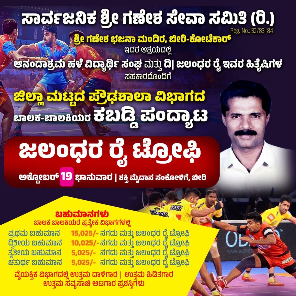 ಬೀರಿ: ಇಲ್ಲಿನ ಕೋಟೆಕಾರ ಶ್ರೀ ಗಣೇಶ ಭಜನಾ ಮಂದಿರದ ಆಶ್ರಯದಲ್ಲಿ ಸಾರ್ವಜನಿಕ ಶ್ರೀ ಗಣೇಶ ಸೇವಾ ಸಮಿತಿ ವತಿಯಿಂದ “ಜಲಂಧರ ರೈ ಟ್ರೋಫಿ” ಜಿಲ್ಲಾ ಮಟ್ಟದ ಪ್ರೌಢಶಾಲಾ ವಿಭಾಗದ ಬಾಲಕ-ಬಾಲಕಿಯರ ಕಬಡ್ಡಿ ಪಂದ್ಯಾಟವನ್ನು ಅ. 19 ಶಕ್ತಿ ಮೈದಾನ, ಸಂಕೋಳಿಗೆ, ಬೀರಿಯಲ್ಲಿ ಆಯೋಜಿಸಲಾಗಿದೆ. ಈ ಪಂದ್ಯಾಟವನ್ನು ಆನಂದಾಶ್ರಮ ಹಳೆ ವಿದ್ಯಾರ್ಥಿ ಸಂಘ ಹಾಗೂ ದಿ| ಜಲಂಧರ ರೈ ಇವರ ಹಿತೈಷಿಗಳು ಸಹಯೋಗದಲ್ಲಿ ನಡೆಸಲಾಗುತ್ತಿದೆ.