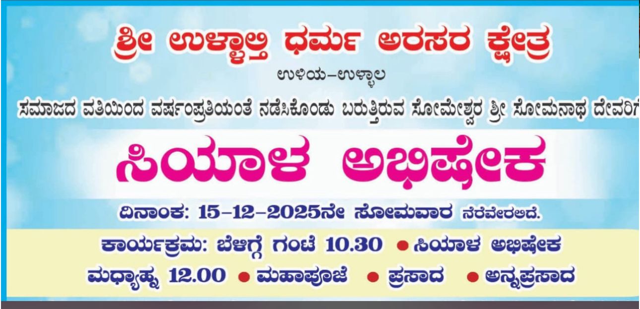 ಶ್ರೀ ಉಳ್ಳಾಲ್ತಿ ಧರ್ಮ ಅರಸರ ಕ್ಷೇತ್ರ ಉಳಿಯ- ಉಳ್ಳಾಲ ಸಮಾಜದ ವತಿಯಿಂದ ವರ್ಷಂಪ್ರತಿಯ0ತೆ ನಡೆಸಿಕೊಂಡು ಬರುತ್ತಿರುವ ಸೋಮೇಶ್ವರ ಶ್ರೀ ಸೋಮನಾಥ ದೇವರಿಗೆ ಸಿಯಾಳ ಅಭಿಷೇಕ ಡಿ.15ರಂದು ನೆರವೇರಲಿದೆ.