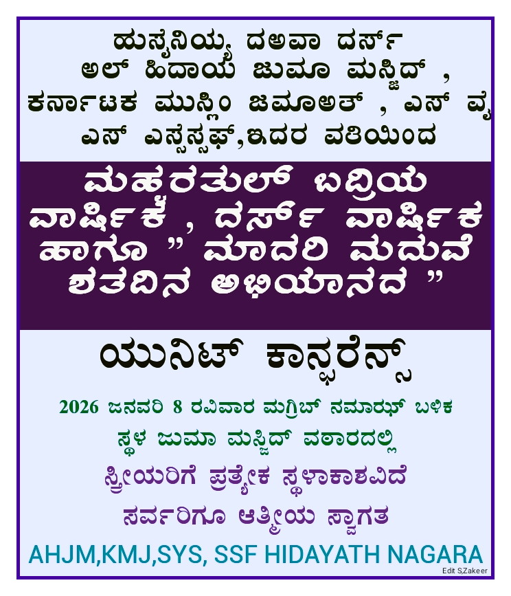 ಹಿದಾಯತ್ ನಗರ:ಕೋಟೆಕಾರ್ ಹುಸೈನಿಯ್ಯ ದಅವಾ ದರ್ಸ್ ಅಲ್ ಹಿದಾಯ ಜುಮಾ ಮಸ್ಜಿದ್ ,ಕರ್ನಾಟಕ ಮುಸ್ಲಿಂ ಜಮಾಅತ್ ,ಎಸ್ ವೈ ಎಸ್,ಎಸ್ಸೆಸ್ಸಫ್, ಹಿದಾಯತ್ ನಗರ ಇದರ ವತಿಯಿಂದ ಮಹ್ಳರತುಲ್ ಬದ್ರಿಯ ವಾರ್ಷಿಕ , ದರ್ಸ್ ವಾರ್ಷಿಕ ಹಾಗೂ ” ಮಾದರಿ ಮದುವೆ ಶತದಿನ ಅಭಿಯಾನದ ” ಪ್ರಯುಕ್ತ ಯೂನಿಟ್ ಕಾನ್ಫರೆನ್ಸ್ ಮಸೀದಿ ಖತೀಬ್ ಅಬ್ದುಲ್ ಅಝೀಝ್ ಸಅದಿ ಅಲ್ ಅಫ್ಳಲಿ, ಅವರ ನೇತೃತ್ವದಲ್ಲಿ 2026 ಫೆಬ್ರವರಿ 08 ಆದಿತ್ಯವಾರ ಮಗ್ರಿಬ್ ನಮಾಝ್ ಬಳಿಕ ಮಸೀದಿ ವಠಾರದಲ್ಲಿ ಜರಗಲಿದೆ ಎಂದು ಸಂಘಟಕರು ಪ್ರಕಟನೆಯಲ್ಲಿ ತಿಳಿಸಿದ್ದಾರೆ,