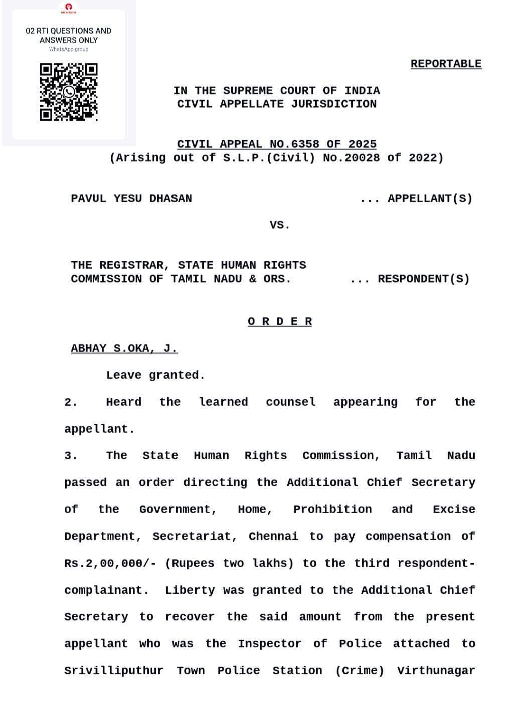 Civil Appeal No. 6358/2025 ಪ್ರಕರಣದಲ್ಲಿ ​ತಮಿಳುನಾಡಿನ ಪೊಲೀಸ್ ಇನ್ಸ್‌ಪೆಕ್ಟರ್ ಒಬ್ಬರು ದೂರು ನೀಡಲು ಬಂದಿದ್ದ ವ್ಯಕ್ತಿಯ ತಾಯಿಯೊಂದಿಗೆ ಅಸಭ್ಯವಾಗಿ ವರ್ತಿಸಿ, ಎಫ್‌ಐಆರ್ ದಾಖಲಿಸಲು ನಿರಾಕರಿಸಿದ್ದರು. ಈ ಪ್ರಕರಣವನ್ನು ಗಂಭೀರವಾಗಿ ಪರಿಗಣಿಸಿದ ರಾಜ್ಯ ಮಾನವ ಹಕ್ಕುಗಳ ಆಯೋಗವು ಅಧಿಕಾರಿಯಿಂದ ₹2 ಲಕ್ಷ ದಂಡ ವಸೂಲಿ ಮಾಡಿ ದೂರುದಾರರಿಗೆ ನೀಡುವಂತೆ ಆದೇಶಿಸಿತ್ತು. ಇದನ್ನು ಪ್ರಶ್ನಿಸಿ ಇನ್ಸ್‌ಪೆಕ್ಟರ್ ಸಲ್ಲಿಸಿದ್ದ ಅರ್ಜಿಯನ್ನು ಸುಪ್ರೀಂ ಕೋರ್ಟ್ ವಜಾಗೊಳಿಸಿದೆ.