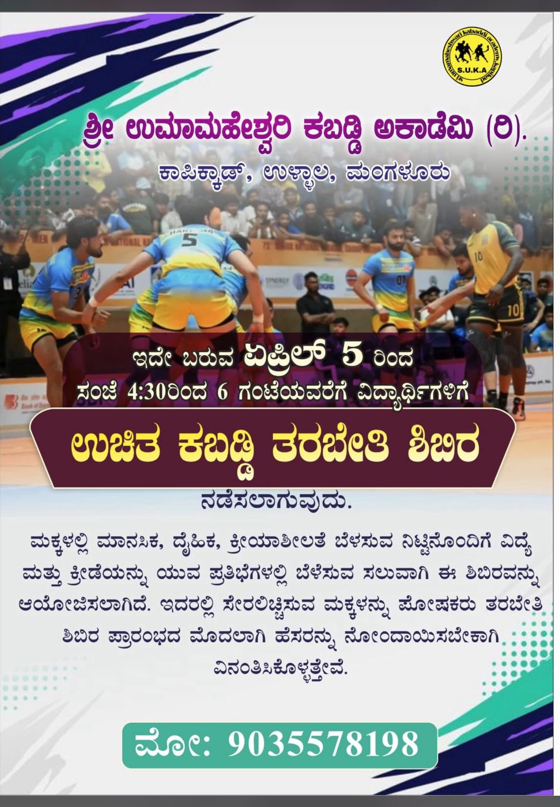 ಉಳ್ಳಾಲ: ತಾಲೂಕಿನ ಕಾಪಿಕ್ಕಾಡ್‌ನಲ್ಲಿ ಕಾರ್ಯನಿರ್ವಹಿಸುತ್ತಿರುವ ಶ್ರೀ ಉಮಾಮಹೇಶ್ವರಿ ಕಬಡ್ಡಿ ಅಕಾಡೆಮಿ (ರಿ.) ವತಿಯಿಂದ ವಿದ್ಯಾರ್ಥಿಗಳಿಗೆ ಉಚಿತ ಕಬಡ್ಡಿ ತರಬೇತಿ ಶಿಬಿರವನ್ನು ಹಮ್ಮಿಕೊಳ್ಳಲಾಗಿದೆ.