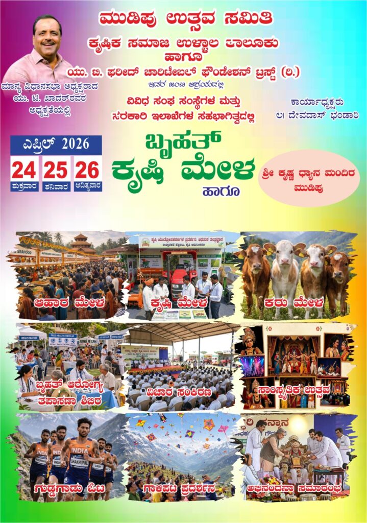 ಮಂಗಳೂರು, ಎ.20: ಮುಡಿಪು ಉತ್ಸವ ಸಮಿತಿ, ಕೃಷಿಕ ಸಮಾಜ ಉಳ್ಳಾಲ ತಾಲೂಕು ಹಾಗೂ ಯು.ಟಿ. ಫರೀದ್ ಫೌಂಡೇಶನ್ ಟ್ರಸ್ಟ್ ಹಾಗೂ ವಿವಿಧ ಸಂಘಟನೆಗಳ ಆಶ್ರಯದಲ್ಲಿ ಬೃಹತ್ ಕೃಷಿ ಮೇಳ ಹಾಗೂ ಮುಡಿಪು ಉತ್ಸವ ಎ.24, 25, 26 ರಂದು ಶ್ರೀ ಕೃಷ್ಣ ಧ್ಯಾನ ಮಂದಿರ, ಮುಡಿಪುವಿನಲ್ಲಿ ನಡೆಯಲಿದೆ ಎಂದು ಕರ್ನಾಟಕ ರಾಜ್ಯ ವಿಧಾನಸಭೆಯ ಸ್ಪೀಕರ್ ಯು.ಟಿ ಖಾದರ್ ತಿಳಿಸಿದ್ದಾರೆ.